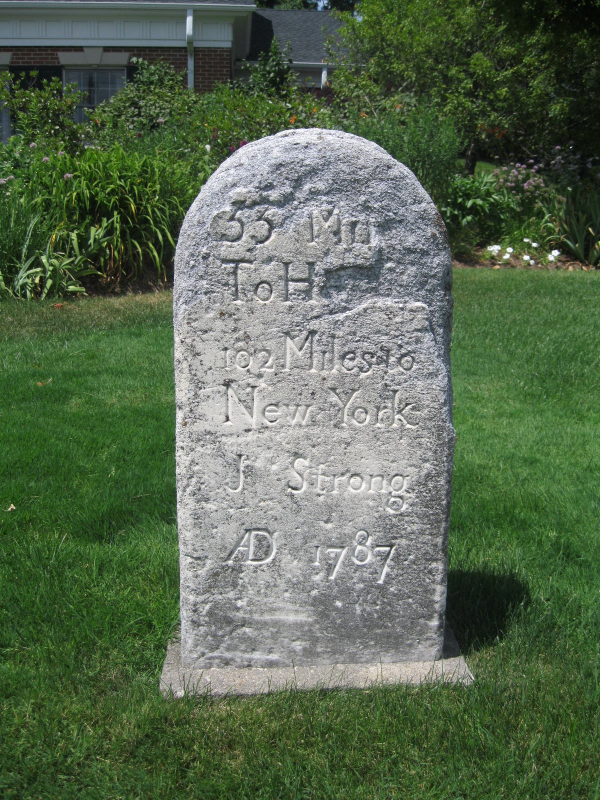 In our age of satellite navigation and laser-guided surveying, it is interesting to ponder how these measurements were made in a much simpler time. Assuming that Jedediah Strong measured these distances himself, he likely did it by attaching an odometer to one of the wheels of his wagon. The Romans possessed this technology, but like many of their innovations, it was lost as Europe entered the so-called Dark Ages. The technology was rediscovered by Benjamin Franklin who, as Postmaster General, was desirous of knowing the shortest routes for sending the mail. His odometer kept count of the number of revolutions made by the wagon wheel; by multiplying the number of revolutions by the circumference of the wheel, he arrived at the distance traveled. (Incidentally, Google Maps states that the distance from Strong’s milestone to Hartford is 33.1 miles, and to the Bowling Green in Manhattan is 101 miles, testimony to the accuracy of the odometers of the time.)