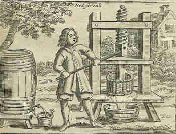 wpressx Apples were ground before pressing.  These ground apples would be placed in a bucket, underneath a wooden disc attached to a screw.  By turning the screw the disc would exert pressure on the apples, turning them into liquid and pulp.  Often the press would double as a cheese press.