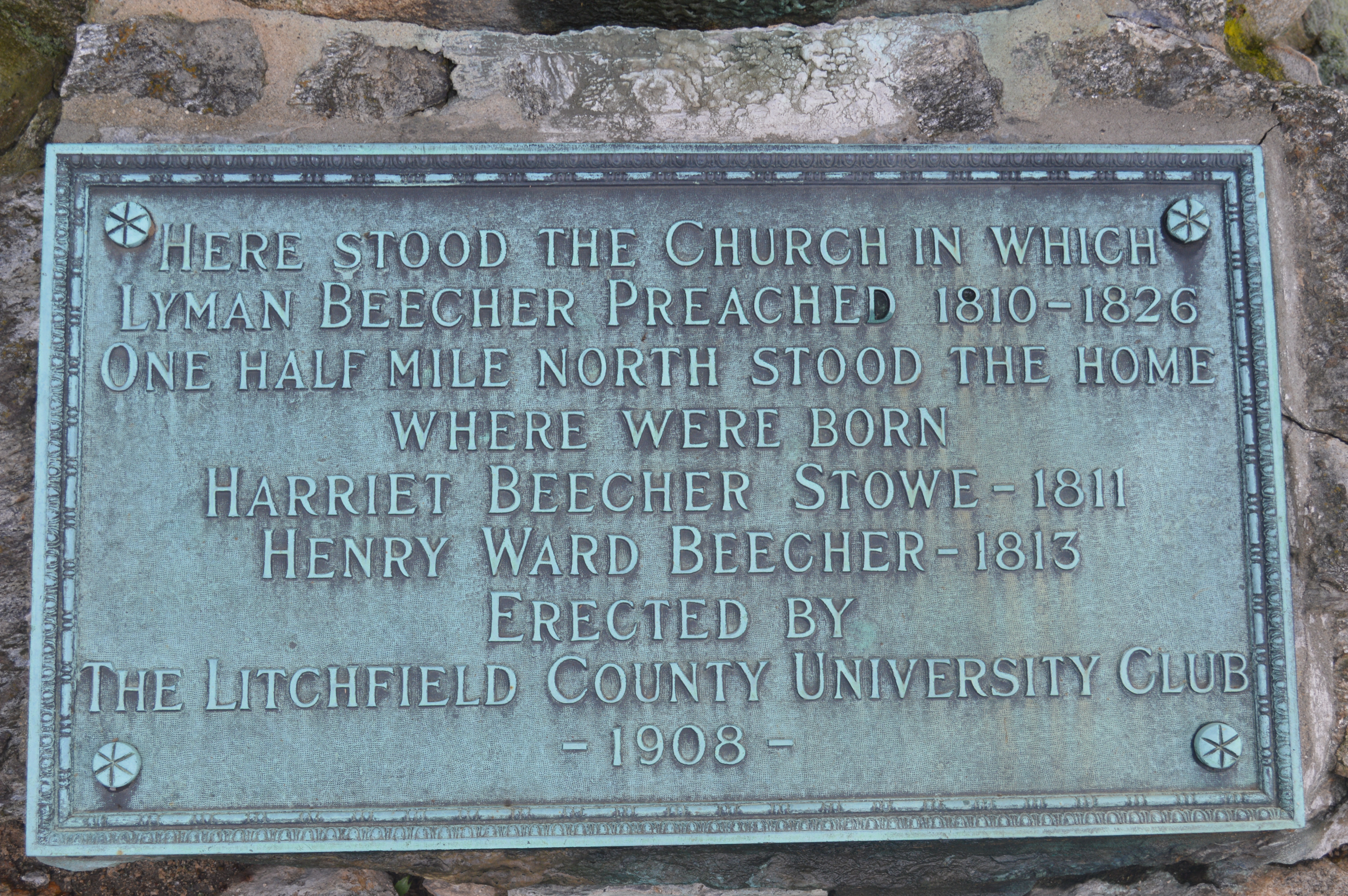 The Beechers’ time in Litchfield ended in 1826 when Lyman moved to a congregation in Boston. Harriet achieved her fame in Cincinnati and Maine, Henry Ward headed the Plymouth Church in Brooklyn, and Catharine opened a school for girls in Hartford. Still, they had a great impact on Litchfield, as remembered by this monument which was erected by the University Club in 1908.