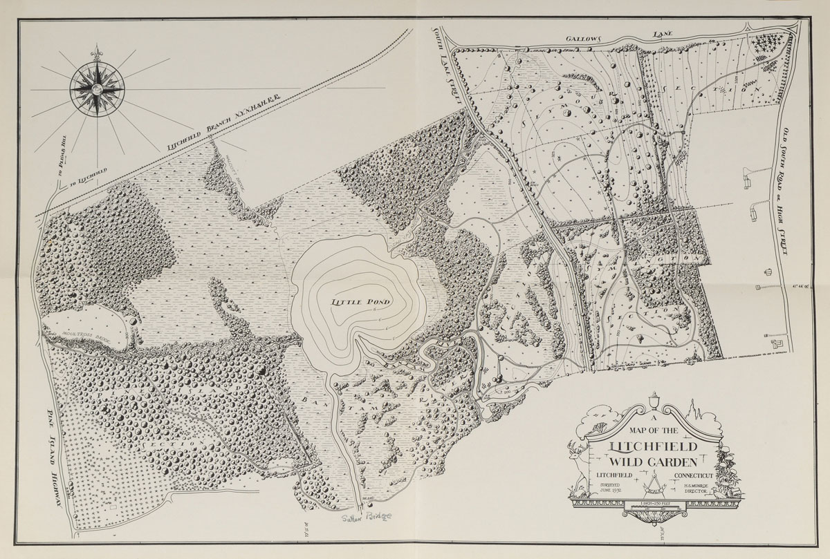 A 1932 map showing the Litchfield Wild Garden. The Sutton Bridge appears at the bottom. “Map of the Litchfield Wild Garden” Litchfield Historical Society, Helga J. Ingraham Memorial Library. Thanks to Linda Hocking at the Litchfield Historical Society for providing the digital image.