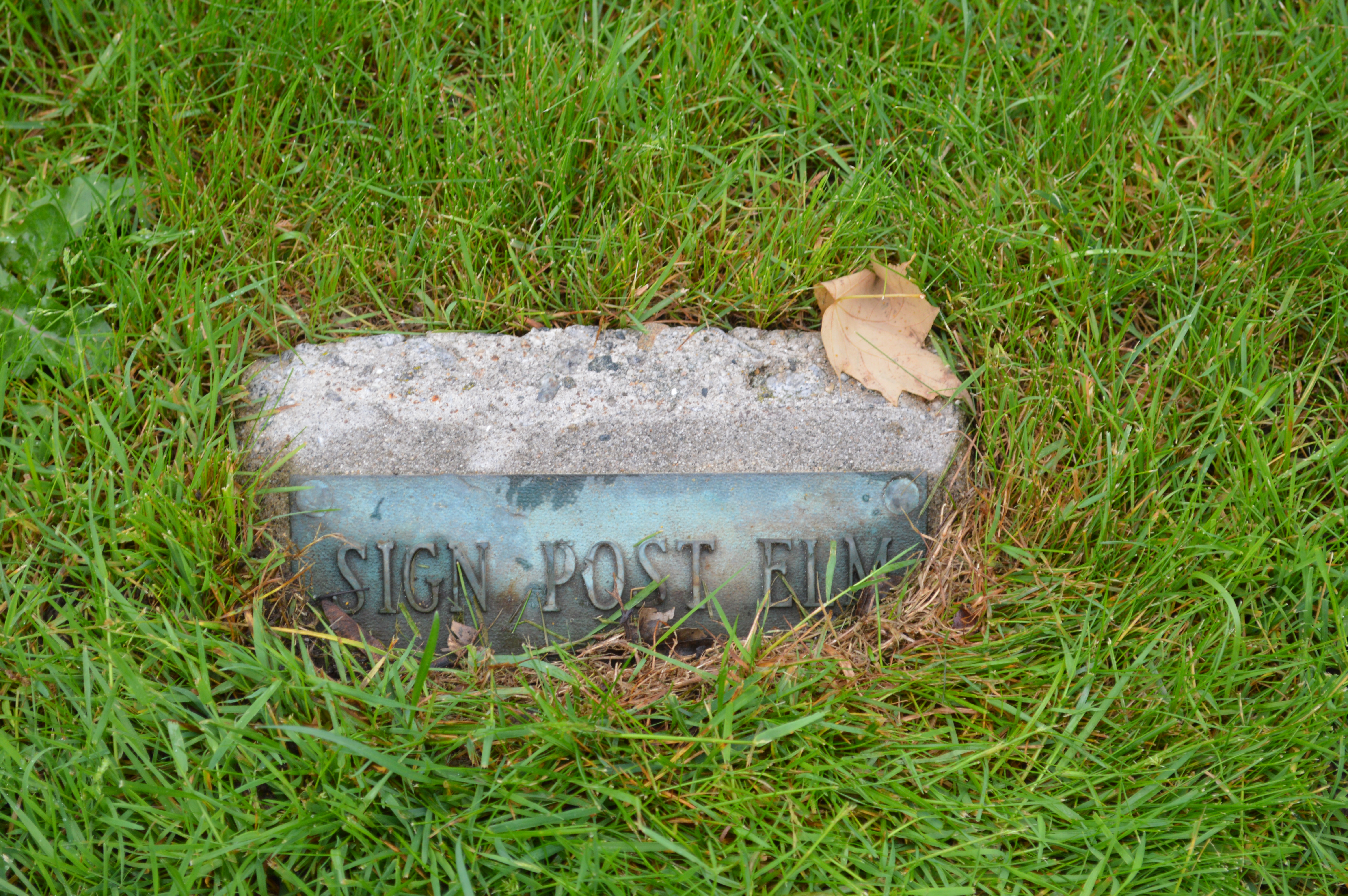 The marker for the sign-post elm is visible as the small stone-like object to the left of the telephone pole in this photograph.